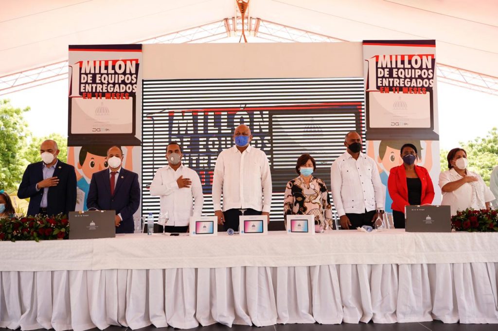 Baní, Peravia.- El ministerio de Educación alcanzó la cifra de un millón de dispositivos tecnológicos entregados a los alumnos del sistema de educación preuniversitaria, en un emotivo acto celebrado en la escuela Máximo Gómez, de Baní, encabezado por el ministro Roberto Fulcar, quien celebró la buena marcha del proceso que busca disminuir la brecha digital.