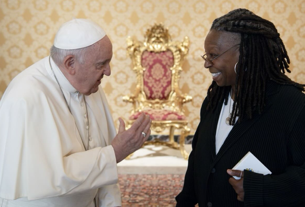 Mientras que Goldberg, que entre sus papeles más conocidos tiene el de la protagonista de “Sister Act”, también publicó una foto en la que escucha atenta y sonriente al pontífice.