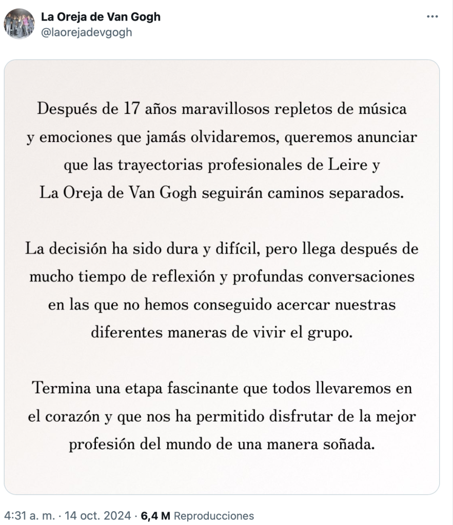 Después de 17 años maravillosos repletos de música y emociones que jamás olvidaremos, queremos anunciar que las trayectorias profesionales de Leire y La Oreja de Van Gogh seguirán caminos separados”, anuncia el grupo.