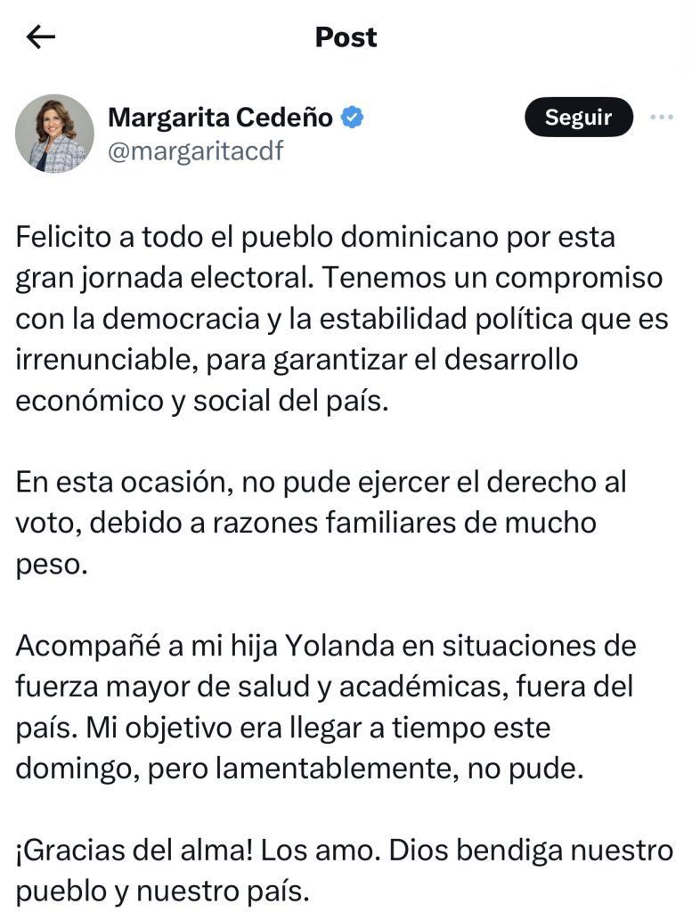 “En esta ocasión, no pude ejercer el derecho al voto, debido a razones familiares de mucho peso. Acompañé a mi hija Yolanda en situaciones de fuerza mayor de salud y académicas, fuera del país. Mi objetivo era llegar a tiempo este domingo, pero lamentablemente, no pude”, indicó.