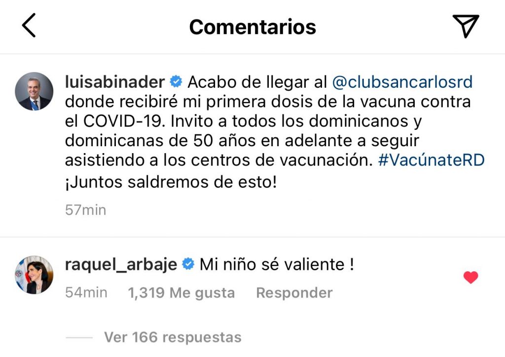 Este miércoles no fue la excepción, y es que previo a que el presidente Luis Abinader recibiera su inoculación contra el covid-19, la Primera Dama Raquel Arbaje envió un corto pero tierno mensaje de aliento a su amado esposo.