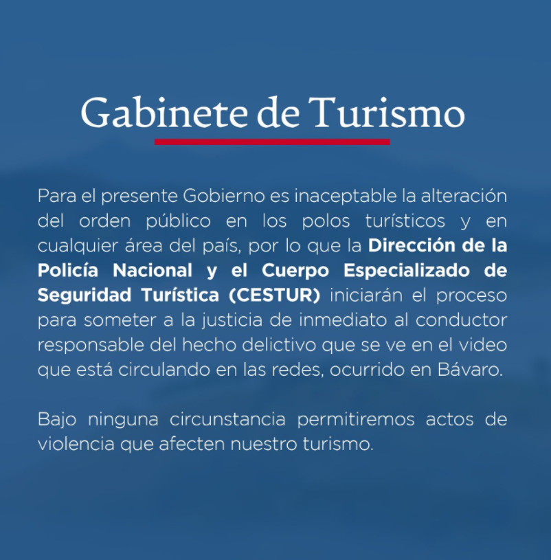 En un mensaje colgado en las redes sociales, Collado explica que el Gabinete de Turismo tiene una posición firme de tolerancia cero a cualquier caso de violencia que altere el orden en los polos turísticos, y en cualquier parte del país.
