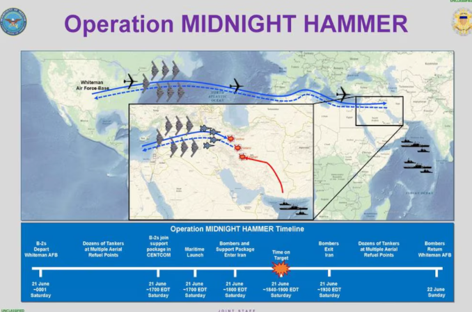 La operación involucró a siete bombarderos B-2 Spirit que partieron desde su base en Misuri hacia Irán, sin ser detectados. El B-2 Spirit, desarrollado por Northrop Grumman, es el único bombardero en el mundo capaz de transportar y lanzar la GBU-57/B Massive Ordnance Penetrator, una bomba antibúnker de 13.600 kilogramos. Su capacidad furtiva (stealth), sustentada en un diseño aerodinámico especial y materiales que reducen la firma radar, permite que la aeronave penetre el espacio aéreo enemigo sin ser detectada.