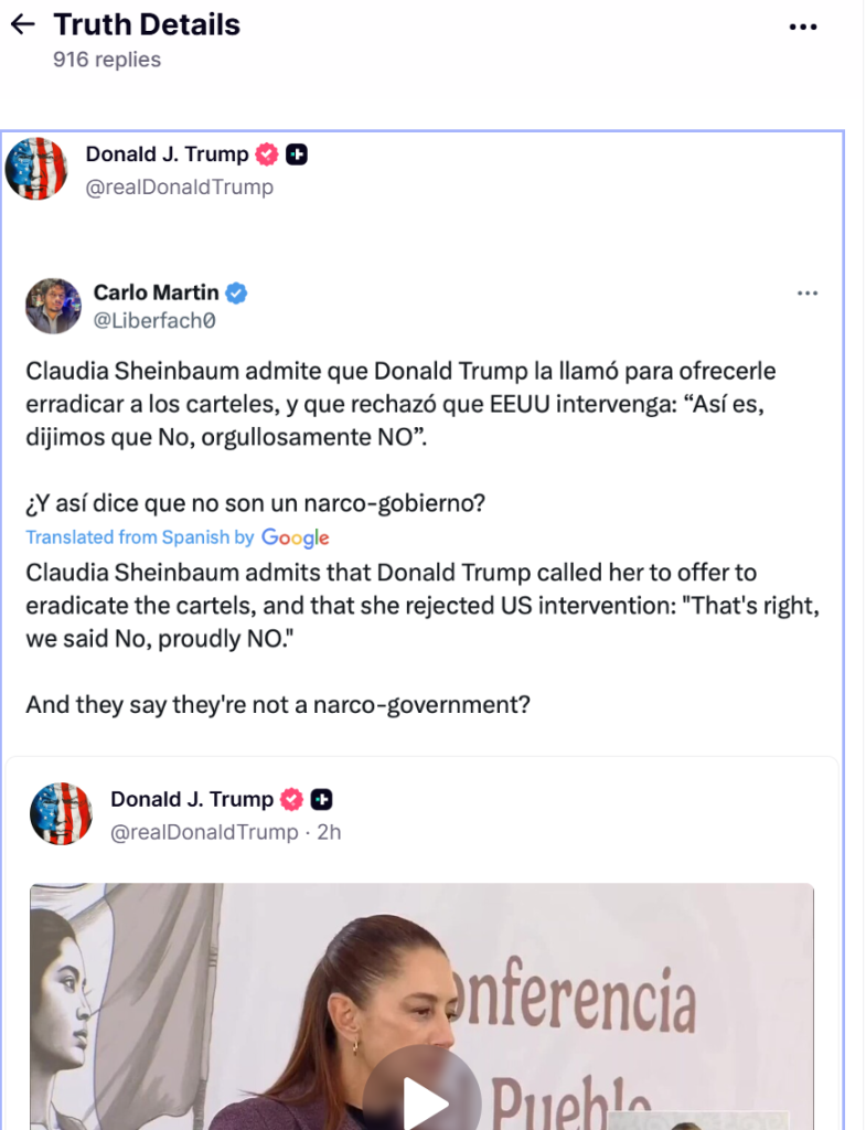 “Claudia Sheinbaum admite que Donald Trump la llamó para ofrecerle erradicar a los cárteles y que rechazó que EE.UU. intervenga. ‘Así que dijimos no, orgullosamente no’. ¿Y así dice que no son un narcogobierno?“, reza el texto republicado este viernes por el mandatario en su perfil de Truth Social.