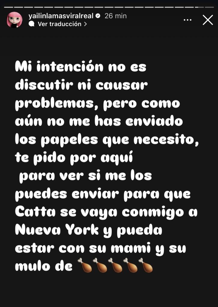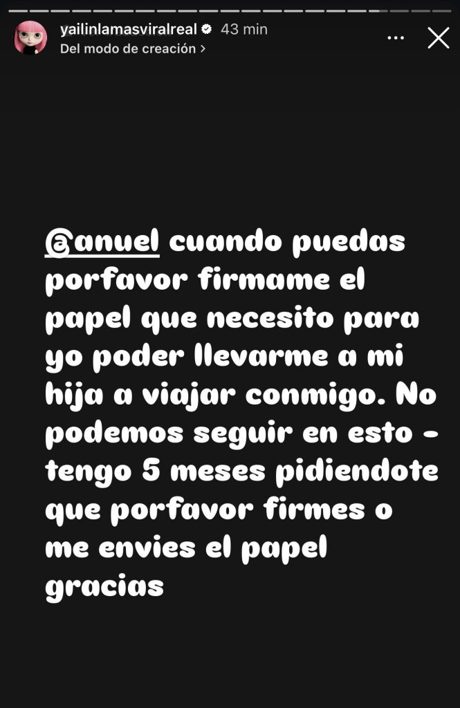 “Cuando puedas por favor fírmame el papel que necesito para yo poder llevarme a mi hija conmigo. No podemos seguir en esto 5 meses pidiéndote que por favor firmes o envíes el papel, gracias”, escribió Yailin.