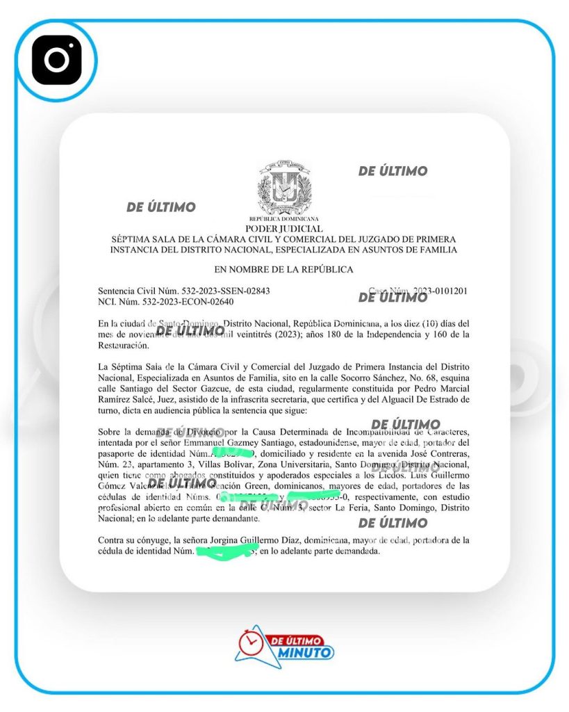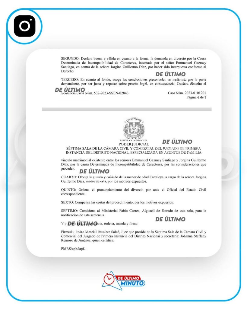 El medio De Último Minuto tuvo acceso a un documento oficial expedido el 10 de noviembre de 2023 por la Séptima Sala de la Cámara Civil y Comercial del Juzgado de Primera Instancia del Distrito Nacional, Especializada en Asuntos de Familia, en la que se especifica que el matrimonio de los cantantes fue disuelto por “incompatibilidad de caracteres”.